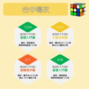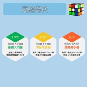 基礎入門營 | 1.9 歲以上 2.沒有學過,或復原時間 120 秒以上 | 1.三階基礎解法 2.基礎異形方塊x3 |